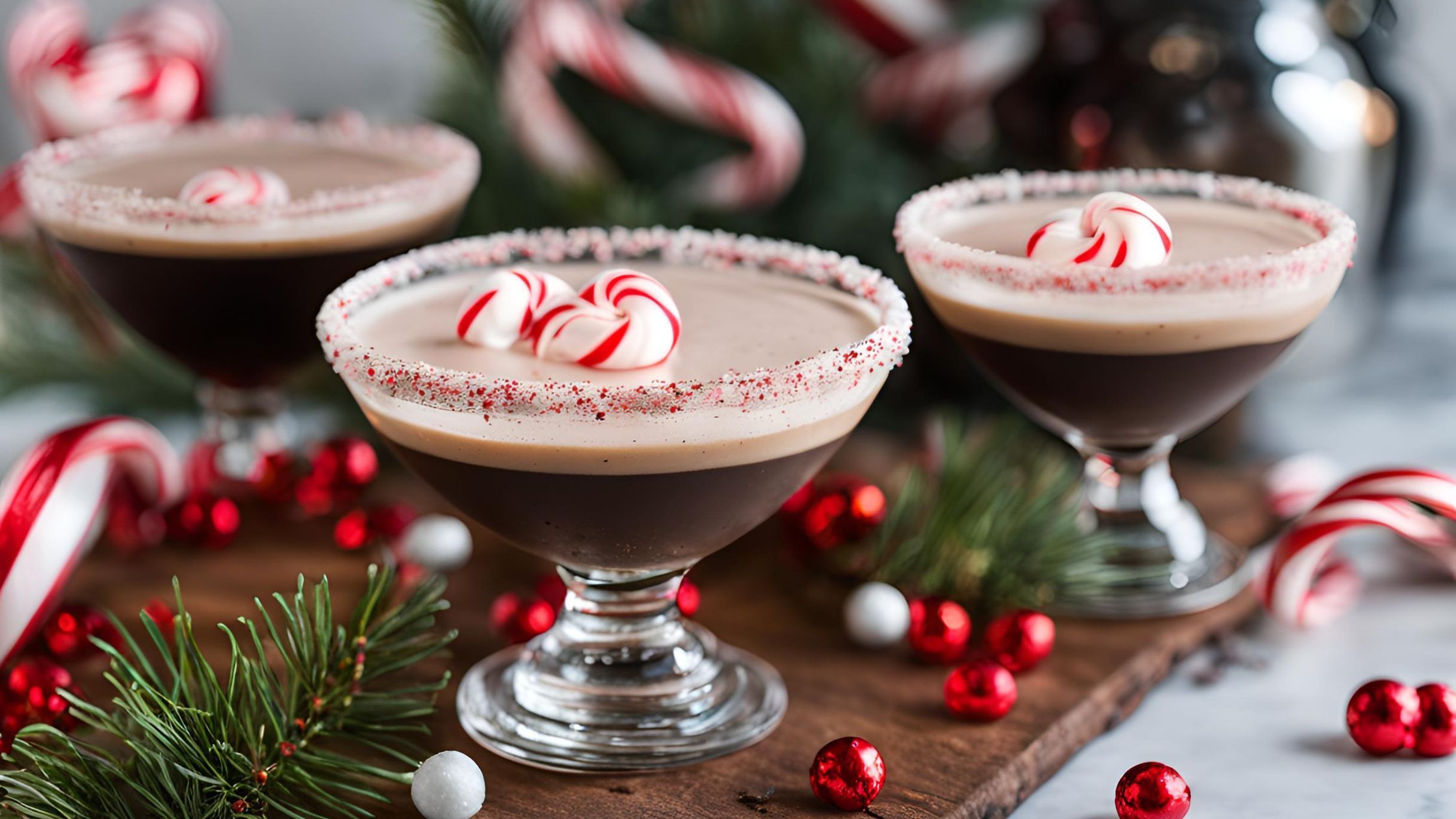 - Prepare the Glasses: Dip the rim of martini glasses in chocolate syrup, then dip in crushed candy canes.