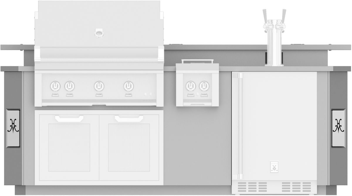 8-foot Outdoor Living Suite with Side Burners consists of multiple cutouts (appliances sold separately) in a suite to accommodate: 36" Hestan Built-in Grill, 36" Hestan Access Door, Drawer/Door Cabinet or Sealed Pantry, 12" Hestan Double Side Burner, 24" Hestan Beer Dispenser.
