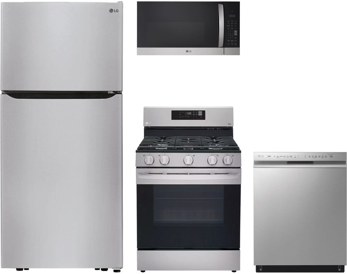 LG 4 Piece Stainless Steel Kitchen Package with top freezer refrigerator, built in dishwasher, freestanding gas range and over the range microwave.Read More