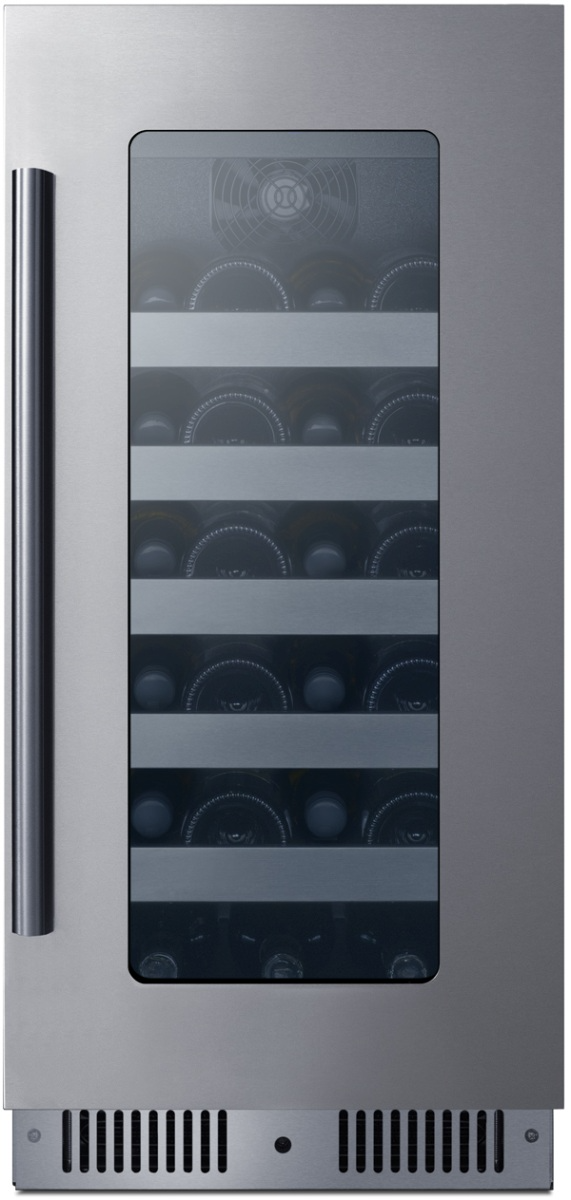 Summit's CL155WC1CSS is a 15" wide single-zone wine cellar designed for residential or commercial settings. The front-breathing system allows built-in installation, while the fully finished stainless steel wrapped cabinet also allows freestanding use. A seamless 304 grade stylish stainless steel trim blends smoothly into the gently tinted glass door for an elevated look, with a professional stainless steel handle included. This unit has a sealed rear and right-angle cord for a better fit. The fully articulating European style hinge design ensures smoother opening. A lock is located in the kickplate for added convenience and security.Read More