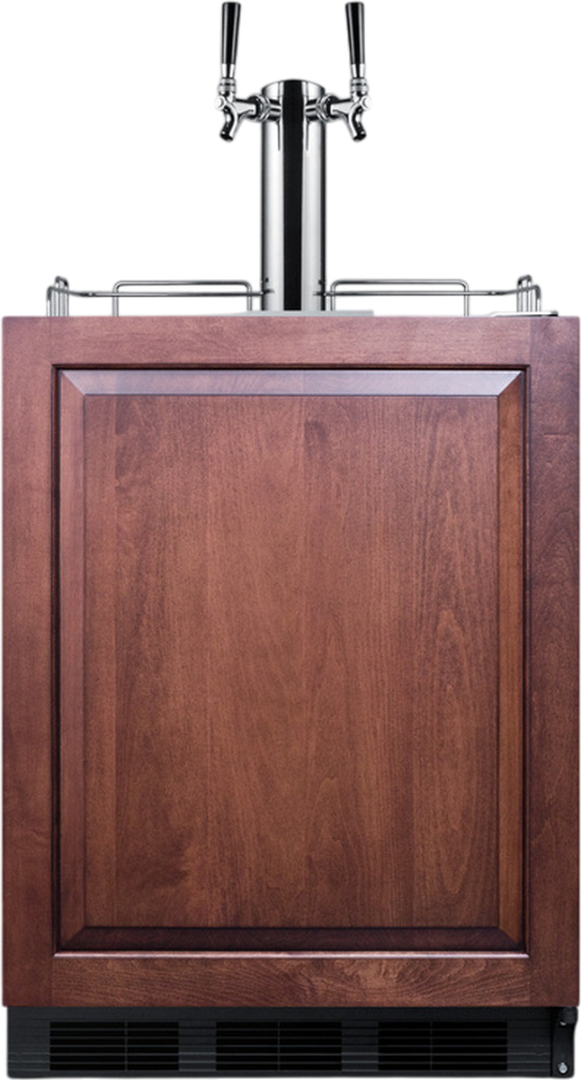 Sized at 32 inches high, the SBC58BLBIADAIFTWINBW is a dual tap wine and beer kegerator designed to fit under lower ADA compliant counters. The front-breathing design allows built-in installation, while the fully finished black cabinet also enables freestanding use. This unit features an integrated stainless steel door frame designed to accept overlay panels, allowing you to create a custom look that blends into your cabinetry. We include a guard rail (ships uninstalled) and removable two-piece stainless steel drip tray for cleaner service. The SBC58BLBIADAIFTWINBW ships with a complete Sankey American dual tap kit complete with a draft tower, one 5 lb. nitrogen/CO2 tank and regulator for wine and one 5 lb. CO2 tank with regulator for beer, and all the equipment you need to serve wine and beer on tap.