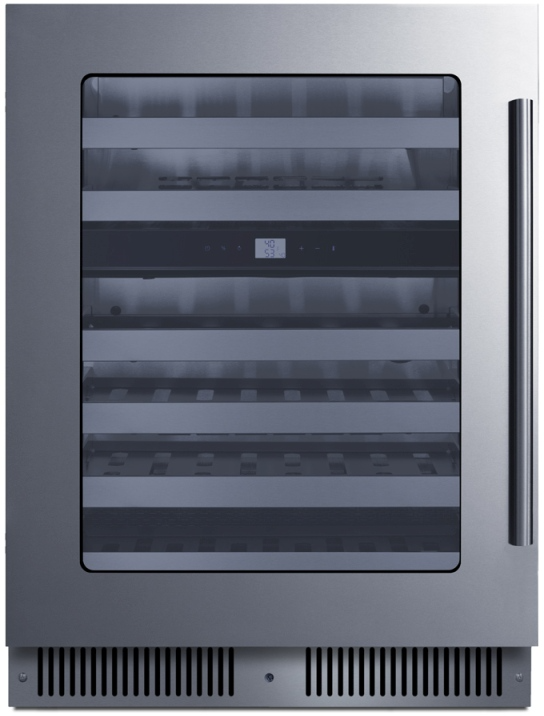 Summit's collection of premium built-in undercounter wine cellars brings full functionality, convenience, and elevated style to kitchens and home bars. Summit's CL244WC2LHD is a 24" wide dual zone wine cellar designed for residential or commercial settings. The front-breathing system allows built-in installation, while the fully finished black cabinet allows freestanding use. Seamless, stylish stainless steel trim blends smoothly into the gently tinted glass door for an elevated look, with a professional stainless steel handle included. This unit has a sealed rear and right-angle cord for a better fit. The fully articulating European-style hinge design ensures a smoother opening.Read More