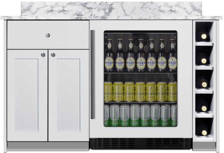 Summit's fully assembled Turnkey Kitchens & Bars bring effortless style & instant living to home bars, ADUs, tiny houses, rental properties, office break rooms, and other hospitality settings. The fully assembled ADA-height Mesa Turnkey Dry Bar in a clean white finish has a two-door storage cabinet, soft-close drawer, and wine cubby designed to hold five bottles. The cabinetry comes in a classic shaker style.Read More