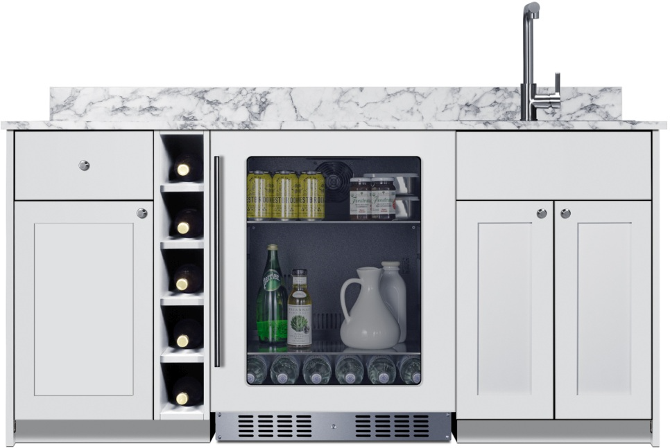 Summit's Turnkey Kitchens & Bars feature pre-installed cabinetry and matching appliances to bring effortless style & instant living to home bars, ADUs, tiny houses, rental properties, office break rooms, and hospitality settings. The Oasis Wet Bar is a 68.5" wide home wet bar in a classic white finish, sized just under 34" to comply with ADA guidelines for lower counter height. We include a matching backsplash for optional use. It also has supply the door knobs in an attractive brushed nickel finish. To maximize storage, this model has two cabinets, a spacious drawer, and a wine cubby designed to hold five wine bottles.Read More