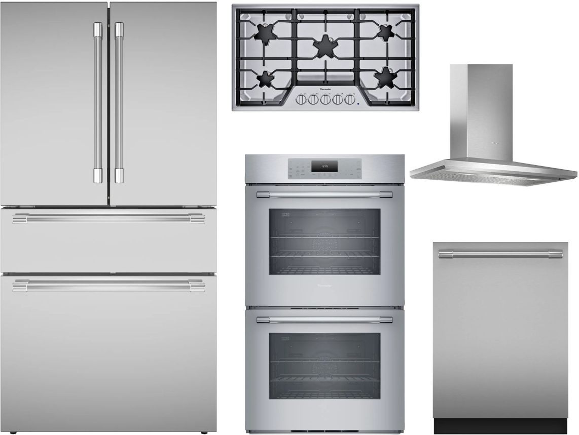 Thermador® 5 Piece Stainless Steel Kitchen Package with a French door refrigerator, double electric wall oven, gas cooktop, built in dishwasher, and wall mounted range hood.Read More