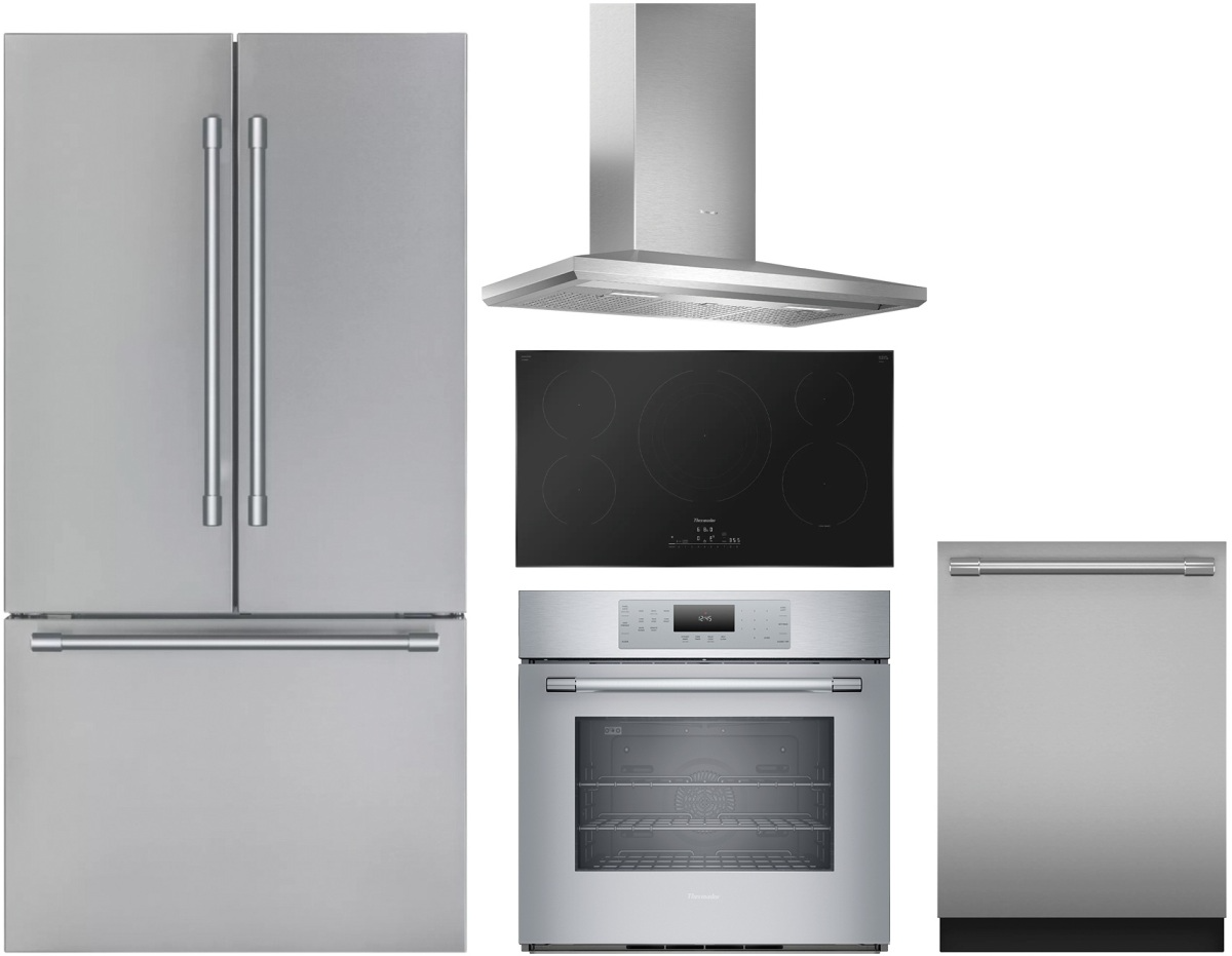 Thermador® 5 Piece Stainless Steel Kitchen Package with counter depth French door refrigerator, top control built in dishwasher, induction cooktop, electric wall oven, and wall mounted range hood.Read More