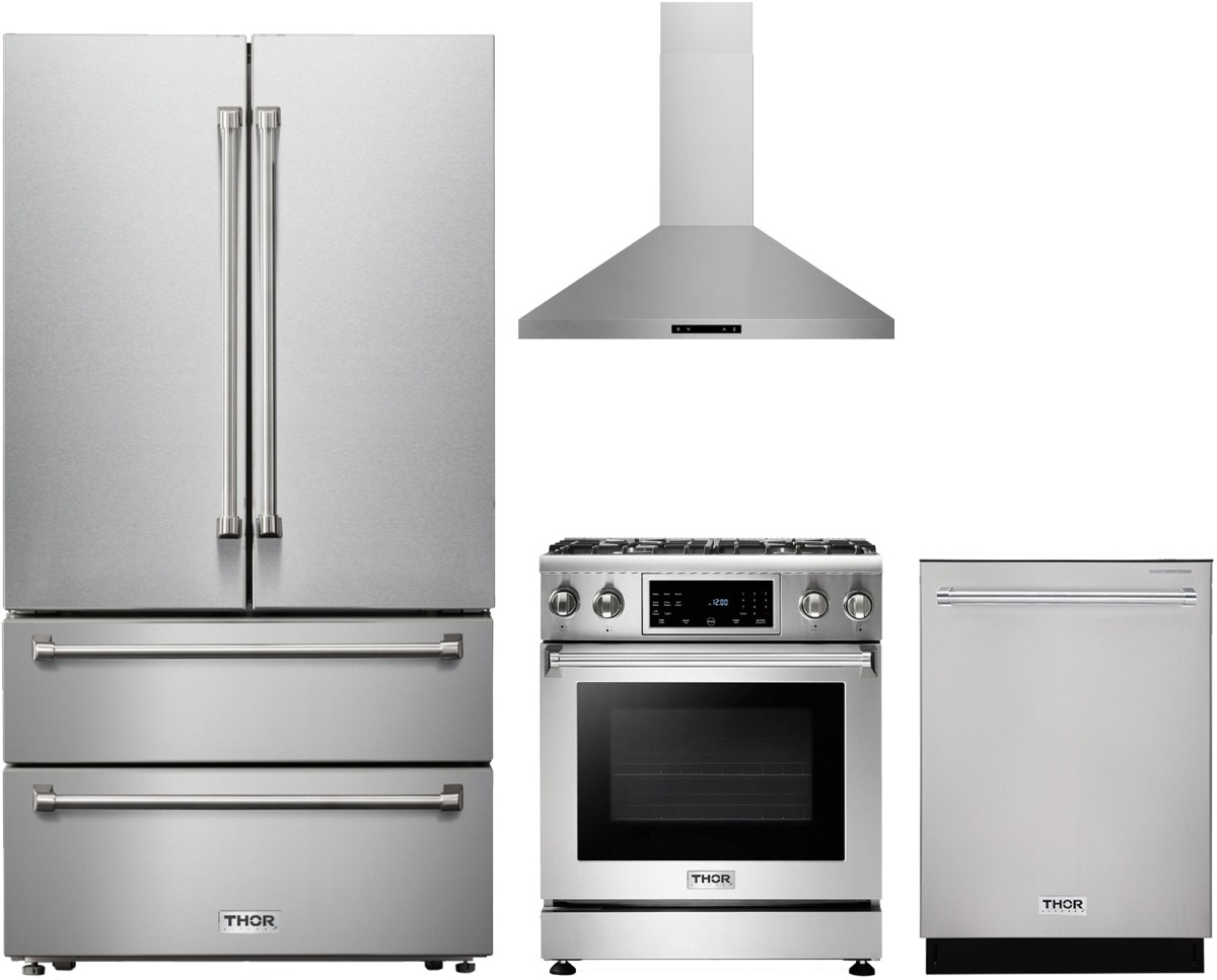 Thor Kitchen® 4 Piece Stainless Steel Kitchen Package with a freestanding gas range, French door refrigerator, built in dishwasher and wall mounted range hood.Read More