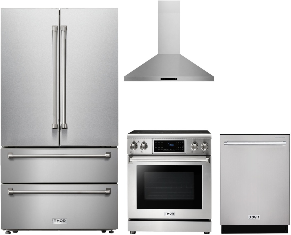 Thor Kitchen® 4 Piece Stainless Steel Kitchen Package with a freestanding electric range, French door refrigerator, built in dishwasher and wall mounted range hood.Read More