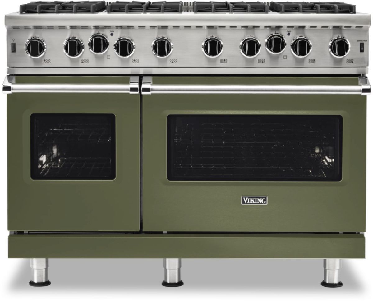Viking® 5 Series 48" Cypress Green Freestanding Gas Range features a VariSimmer™ Setting, Commercial Type Stainless Steel Open Burners, a SureSpark™ Ignition System, a Gourmet-Glo™ Gas Infrared Broiler, and ProFlow™ Convection Baffle.Read More