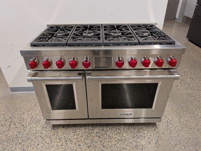Wolf® 48" Stainless Steel Freestanding Dual Fuel Range features dual-stacked, sealed burners, Dual VertiFlow™ convection system, Gourmet Mode, 10 chef-created cooking modes, LED backlit control bezels, self-clean, delayed start, timed cook, and Sabbath features.Read More